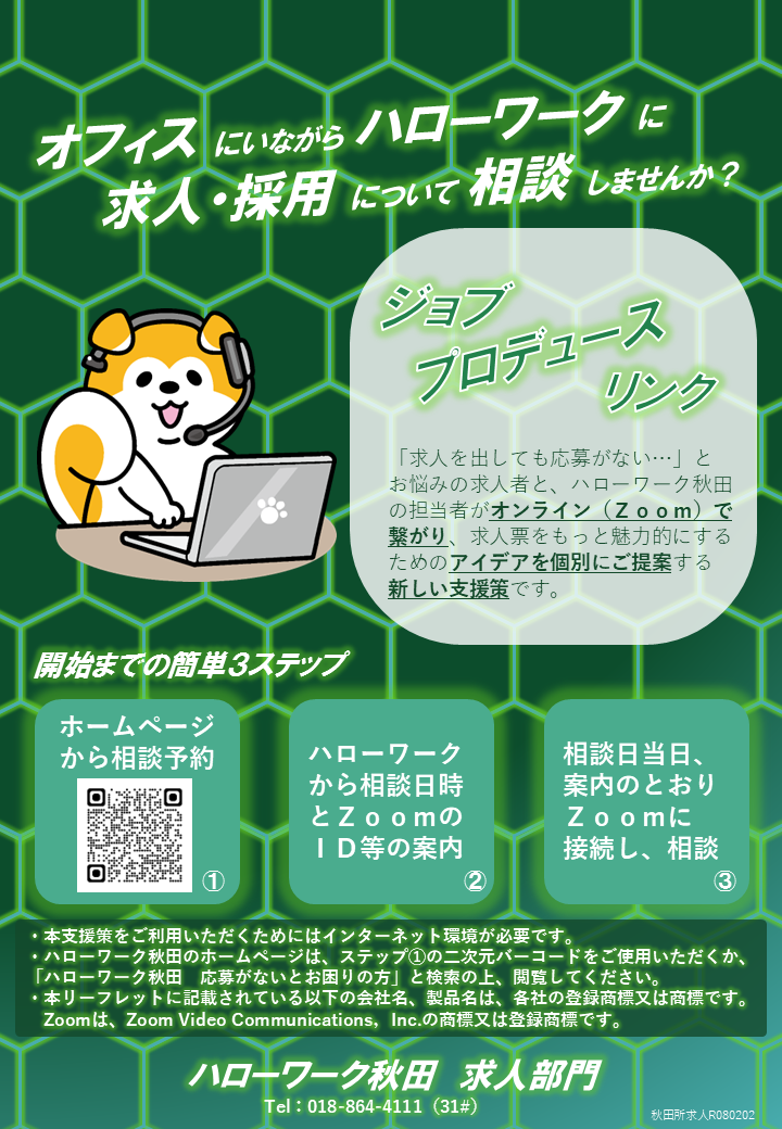 周りを気にせずにじっくり相談でき、ハローワークへ来所する手間がありませんので、お忙しいご担当者様におすすめです。