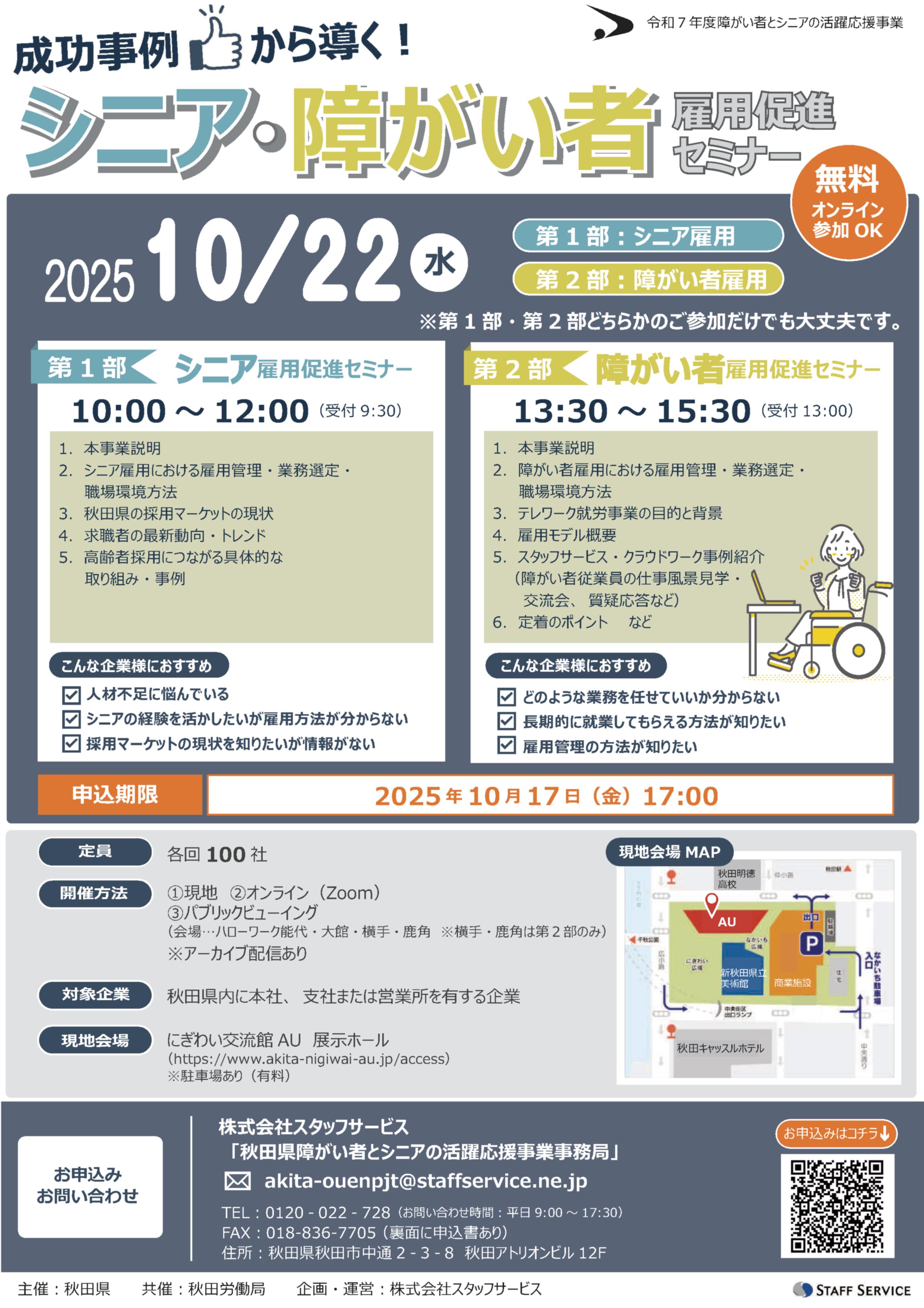 秋田労働局では、秋田県(主催)との共催により、障害者とシニア(高年齢者)の求職者の方や、多様な人材の採用を目指す企業を対象としたセミナーを開催します。