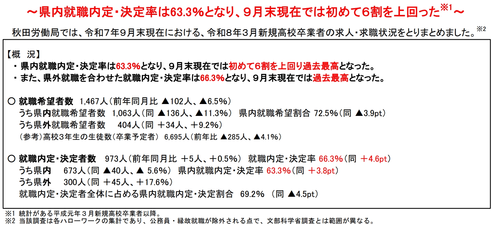 秋田労働局では、令和7年9月末現在における、令和8年3月新規高校卒業者の求人・求職状況をとりまとめました。