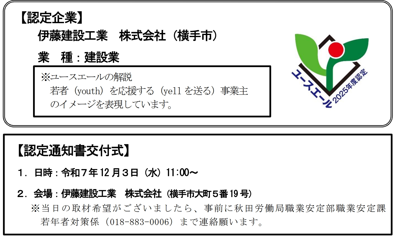このたび、秋田労働局(局長 山本博之)では下記の企業を認定しました。今回の認定により、秋田県内のユースエール認定企業は22 社となりました。