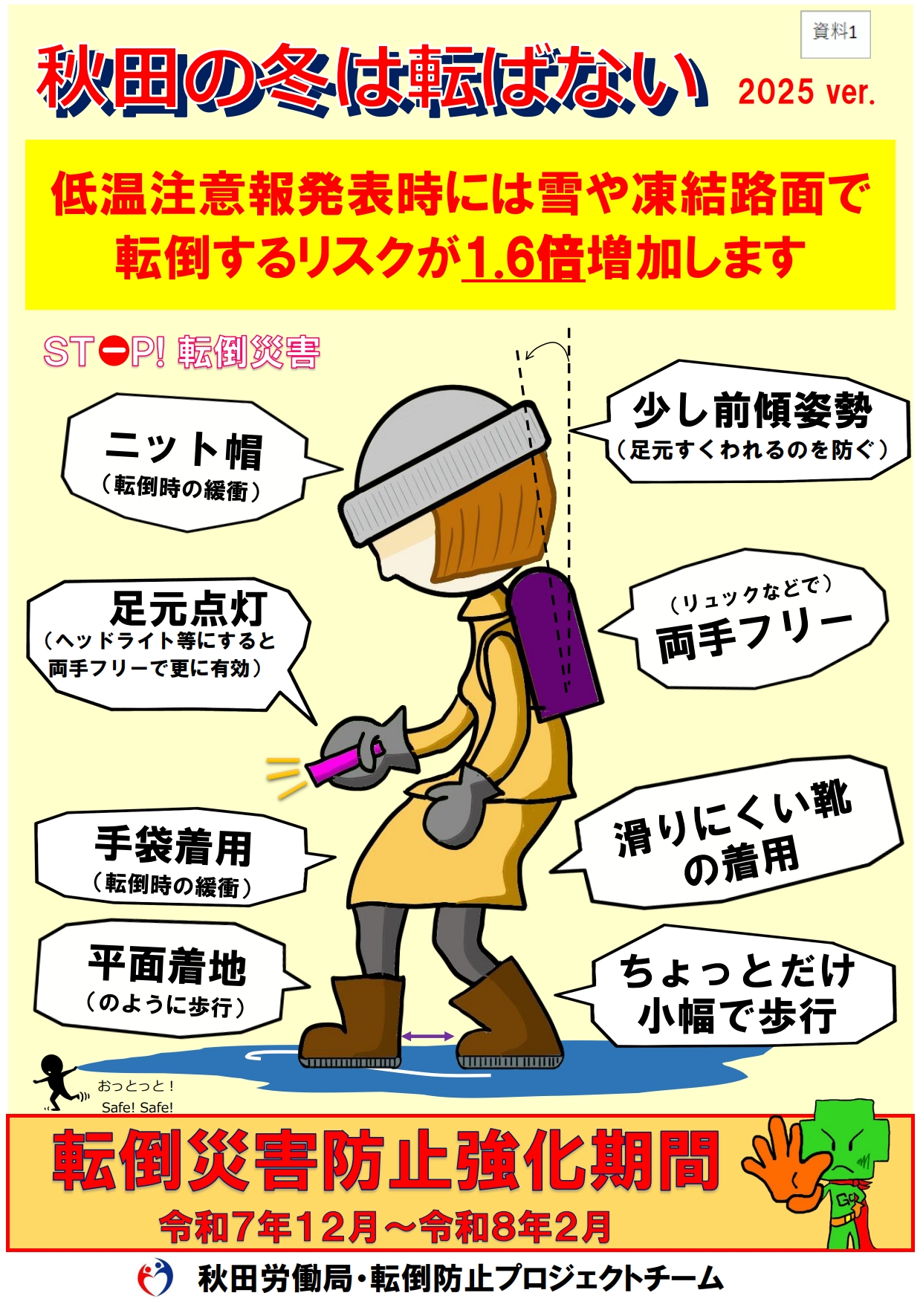 秋田労働局(局長 山本 博之)は、職場における転倒災害を減少させるため、令和7年12月から令和8年2月までを「転倒災害防止強化期間」としてリーフレットを作成し、県内の事業場や関係者団体、市町村等に対して周知等を行うこととしました。