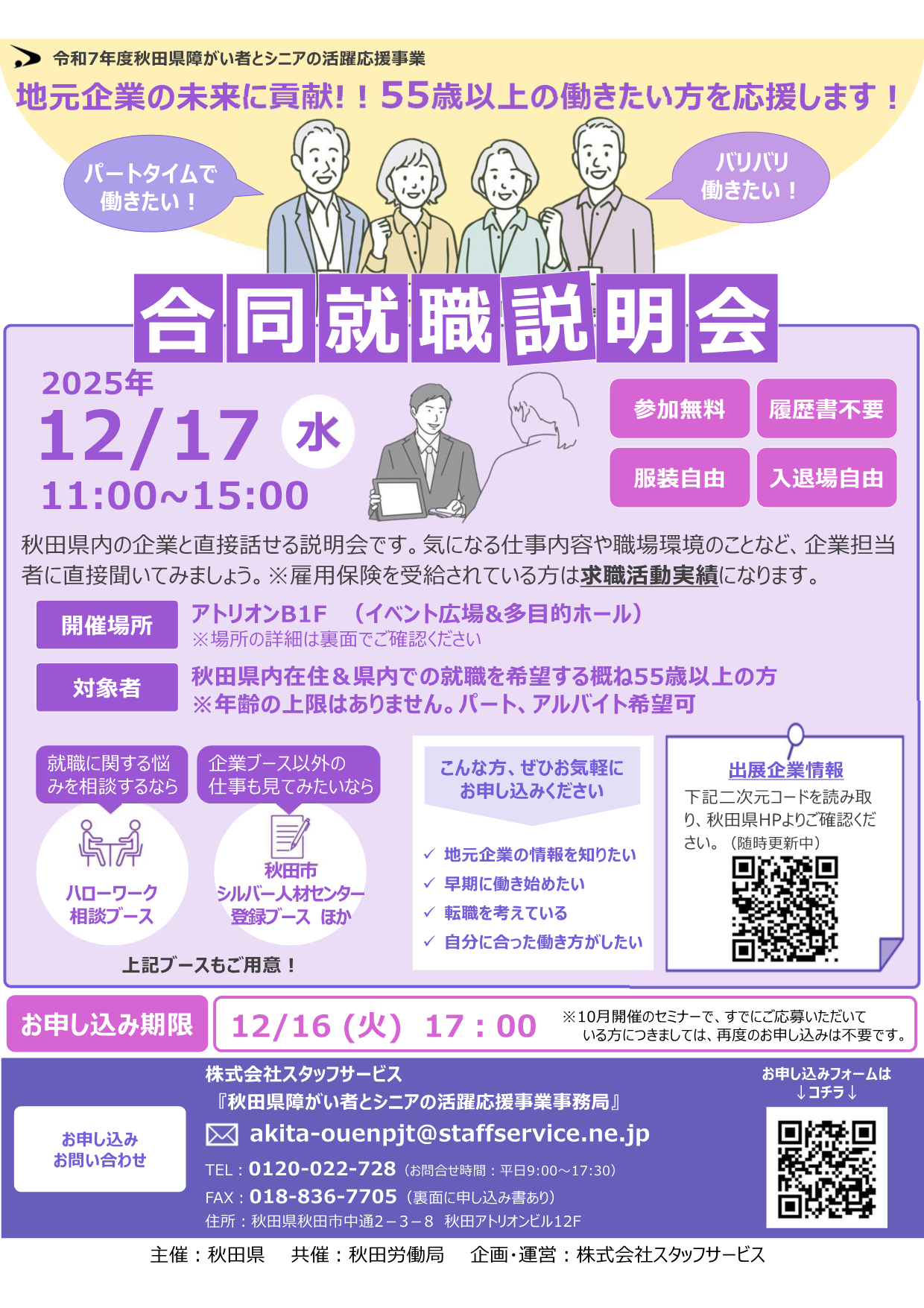 秋田労働局では、秋田県(主催)との共催により、シニアの方の活躍を応援するため、県内企業との「合同就職説明会」を開催します。