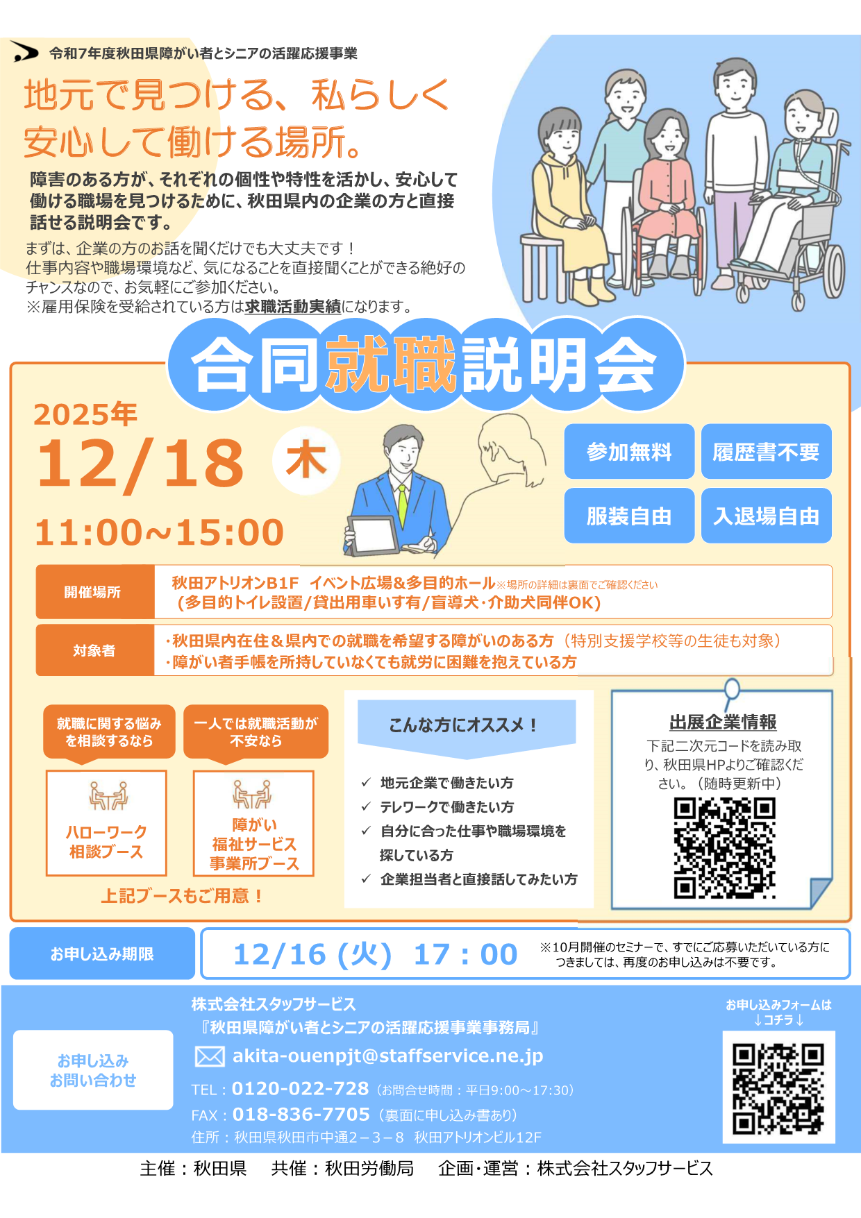 秋田労働局では、秋田県(主催)との共催により、障害をお持ちの方が、それぞれの個性や特性を生かし、安心して働ける職場を見つけるために、県内企業との「合同就職説明会」を開催します。