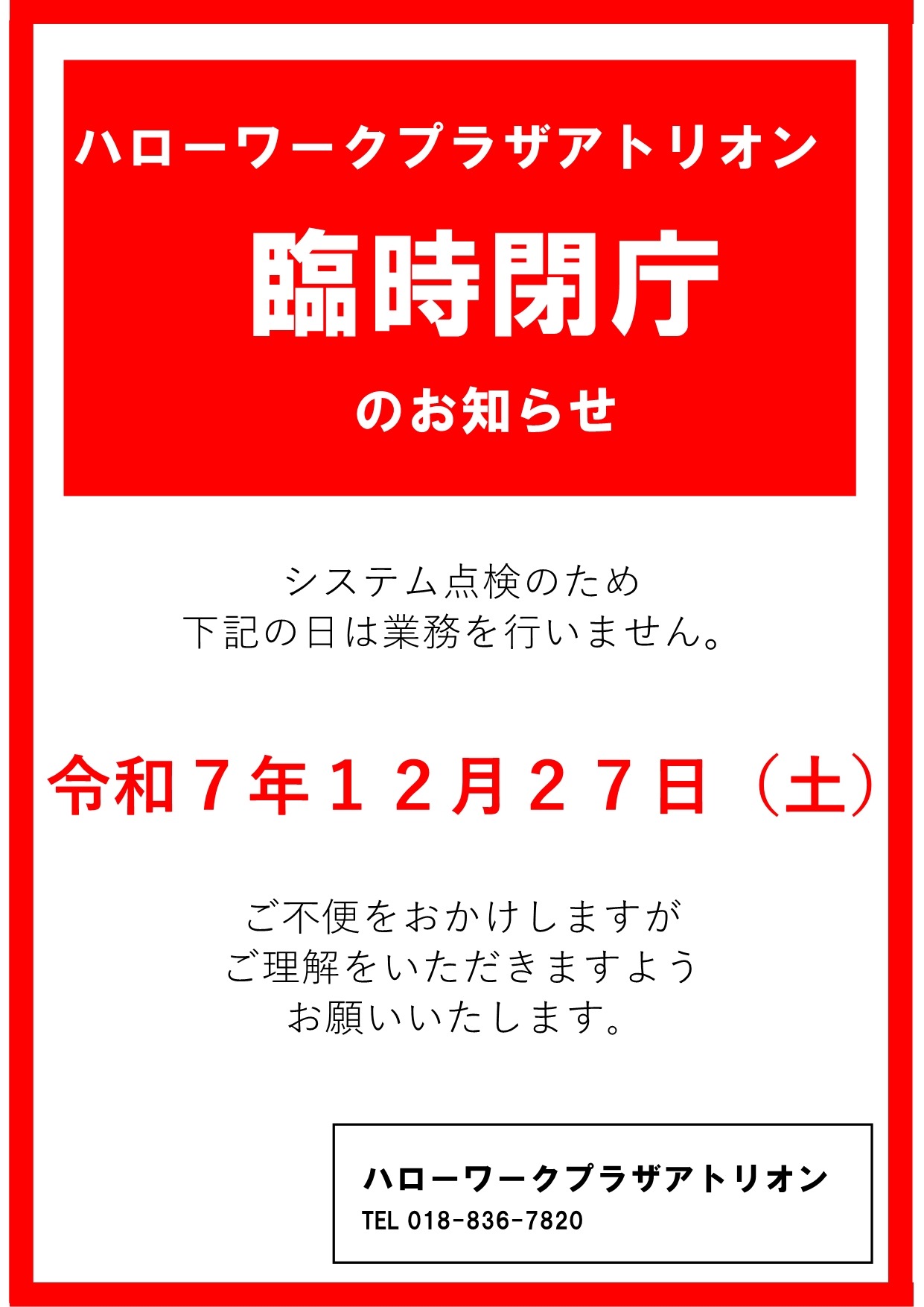 12月27日(土)ハローワークプラザアトリオン臨時閉庁のお知らせ