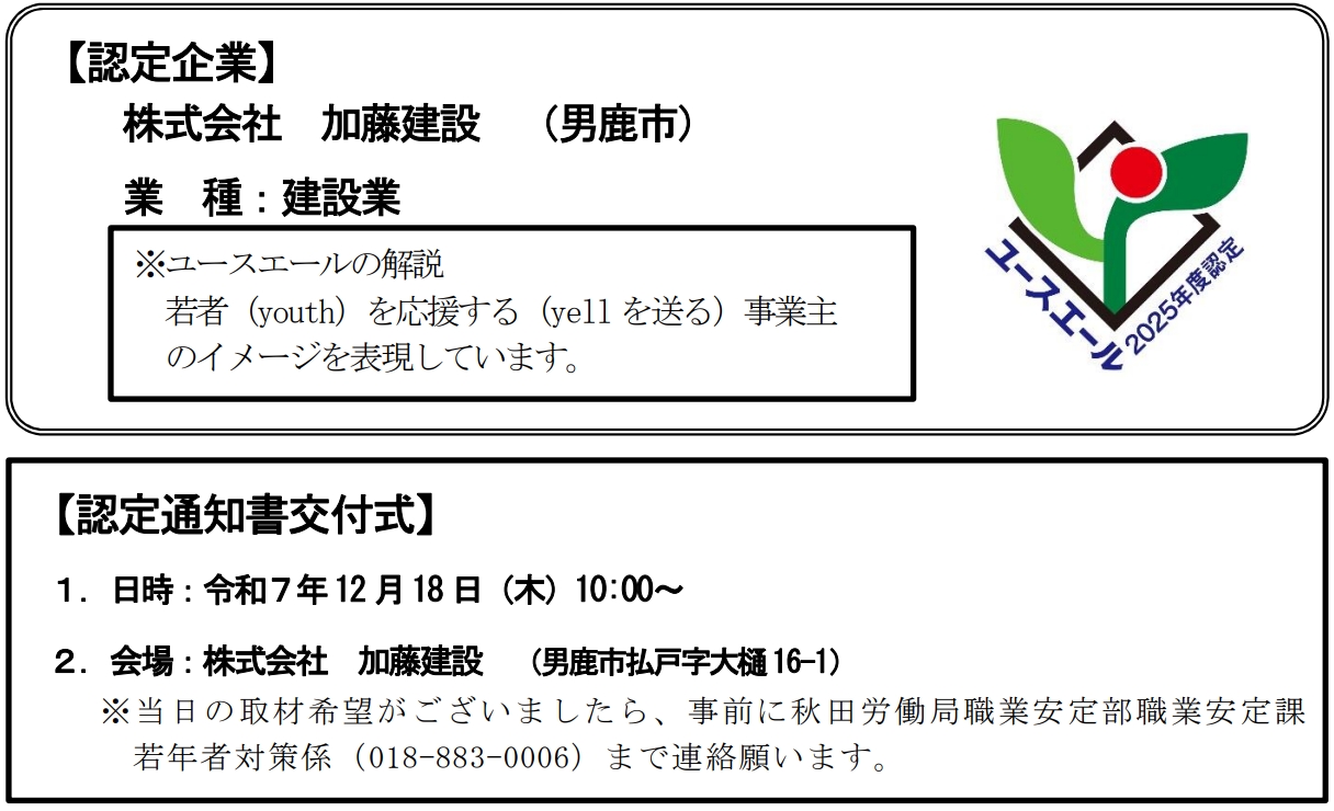 このたび、秋田労働局(局長 山本博之)では下記の企業を認定しました。今回の認定により、秋田県内のユースエール認定企業は22 社となりました。