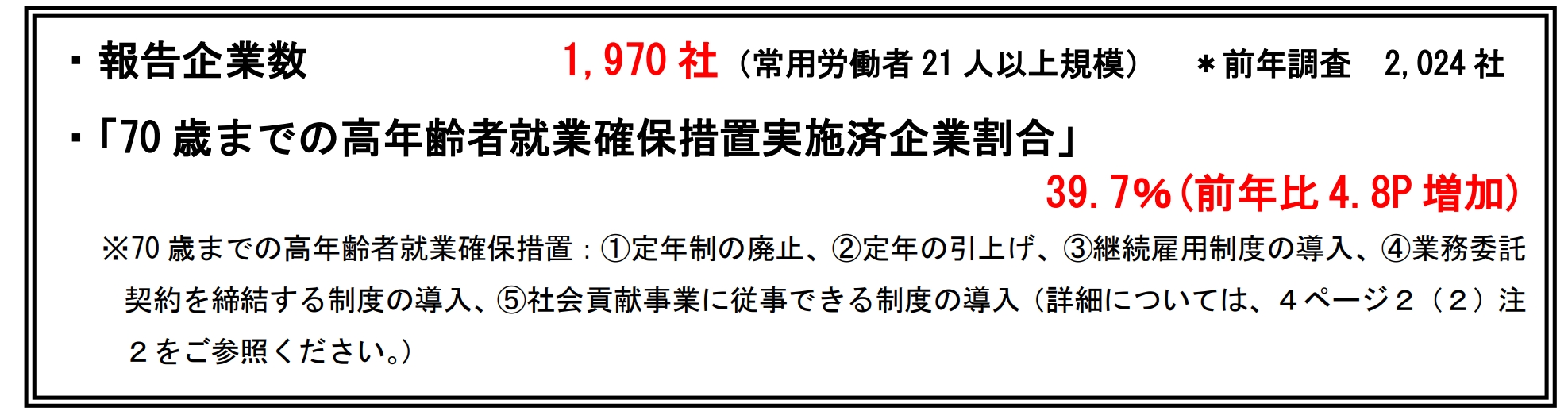 今回の集計結果は、常時雇用する労働者が21人以上の企業1,970社からの報告に基づき、このような高年齢者の雇用等に関する措置について、令和7年6月1日時点での企業における実施状況等をまとめたものです。