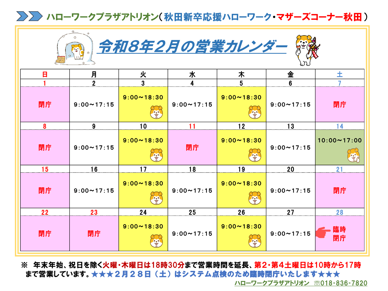 - ハローワークプラザアトリオンの令和8年2月分開庁日カレンダーについて