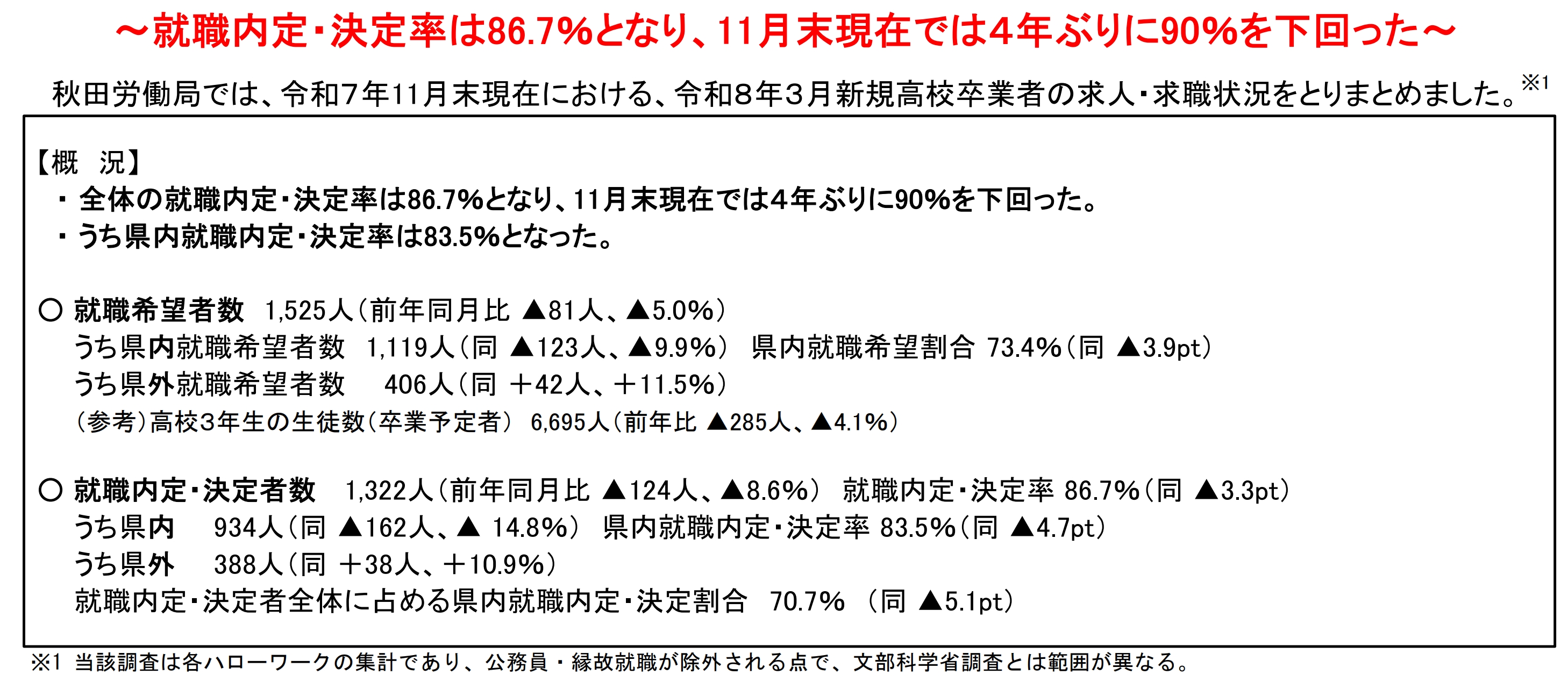 秋田労働局では、令和7年11月末現在における、令和8年3月新規高校卒業者の求人・求職状況をとりまとめました。