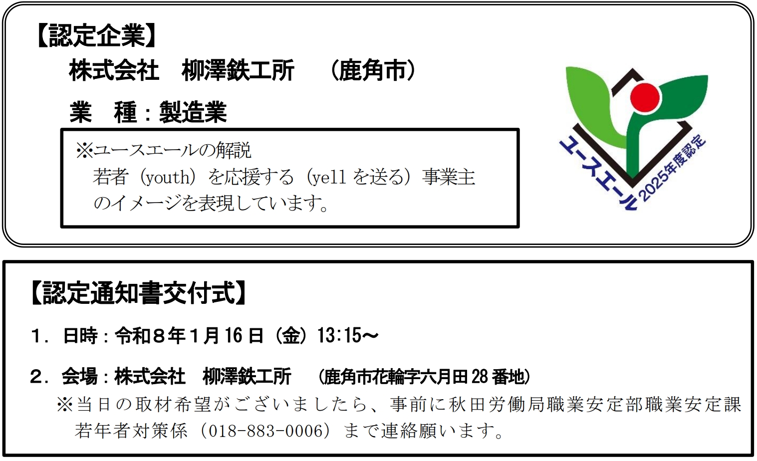 このたび、秋田労働局(局長 山本博之)では下記の企業を認定しました。今回の認定により、秋田県内のユースエール認定企業は23社となりました。