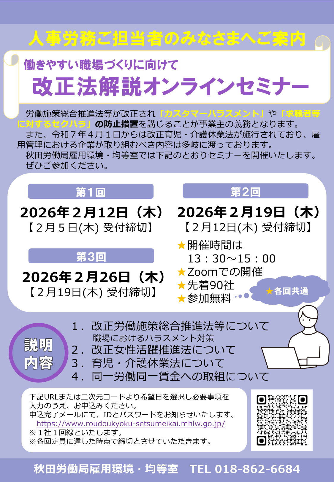 秋田労働局では、広く県内の事業主の方々に改正法等について理解していただくために、オンラインセミナーを開催します。