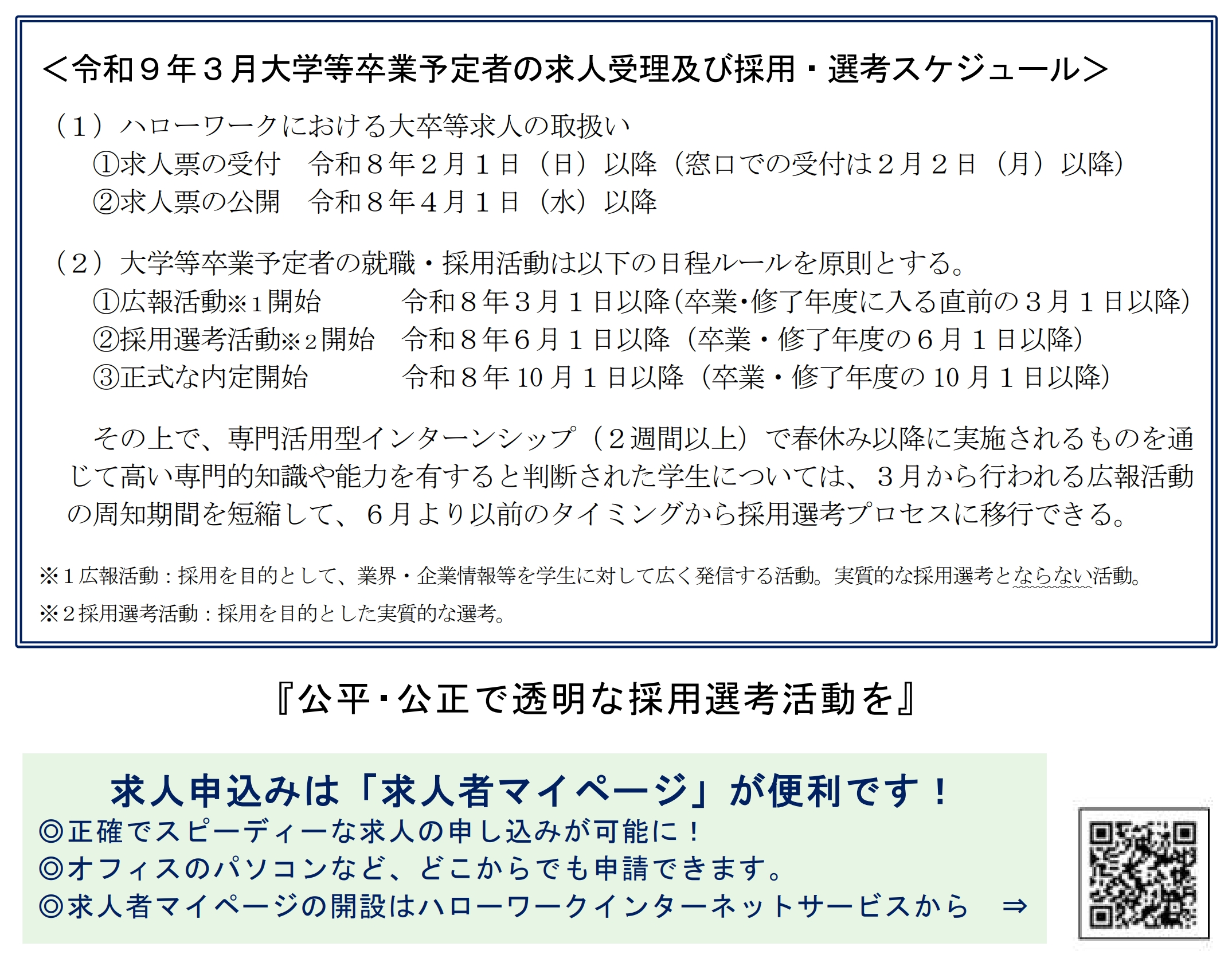 令和9年3月に大学、短期大学、高等専門学校、専修学校及び公共職業能力開発施設等長期間訓練課程卒業・修了予定者(以下「大学等卒業予定者」という。)を対象とする求人の受付を、令和8年2月1日(日)から(県内各ハローワーク窓口での受付は2月2日(月)から)開始します。