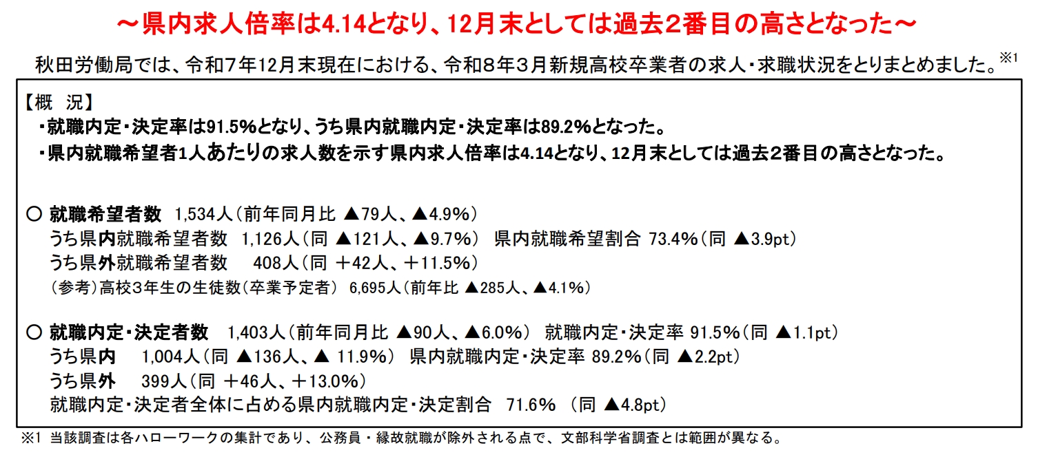 秋田労働局では、令和7年12月末現在における、令和8年3月新規高校卒業者の求人・求職状況をとりまとめました。
