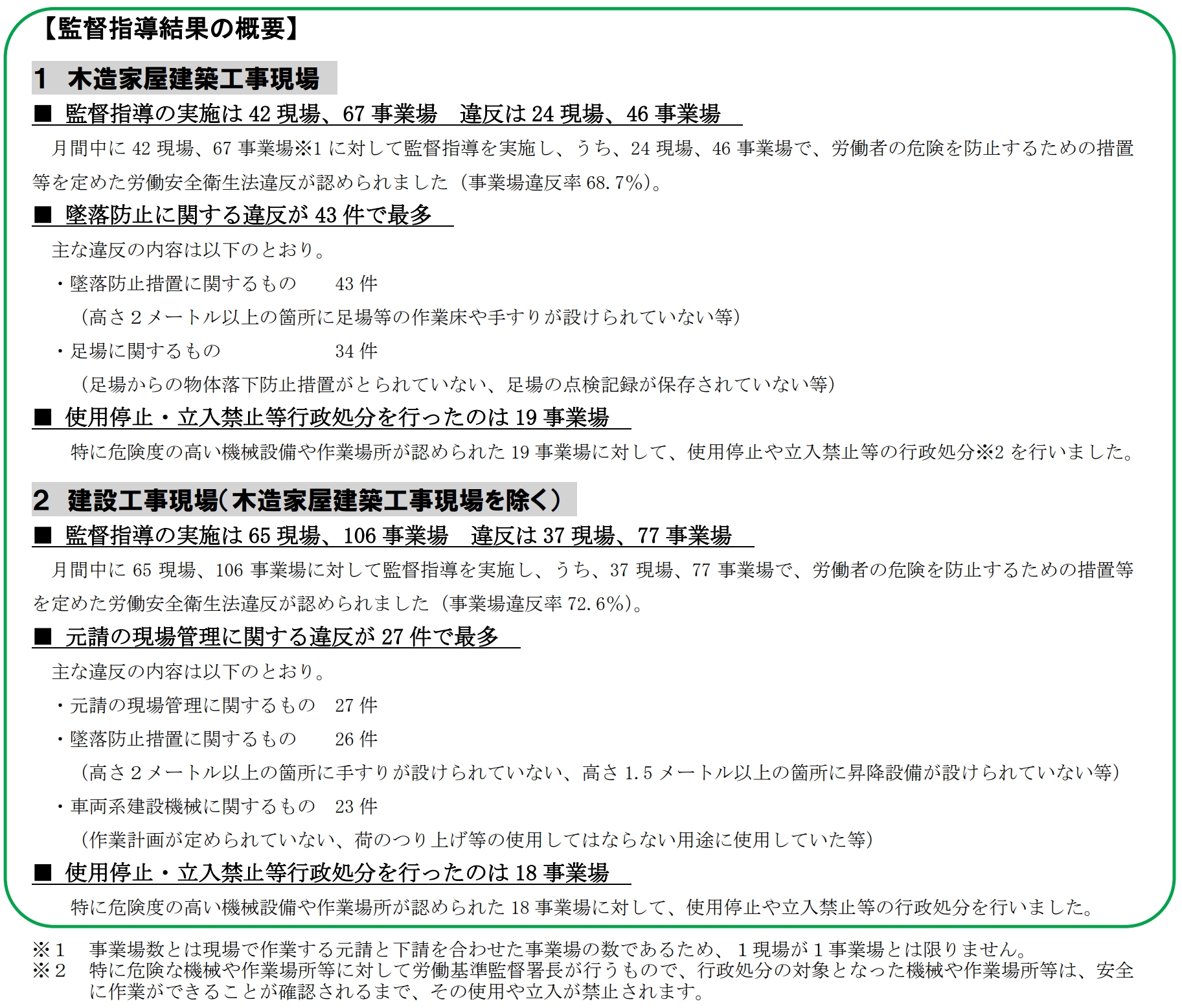 ~木造家屋建築工事現場では「墜落防止」、建設工事現場では「現場管理」に関する違反が最多~