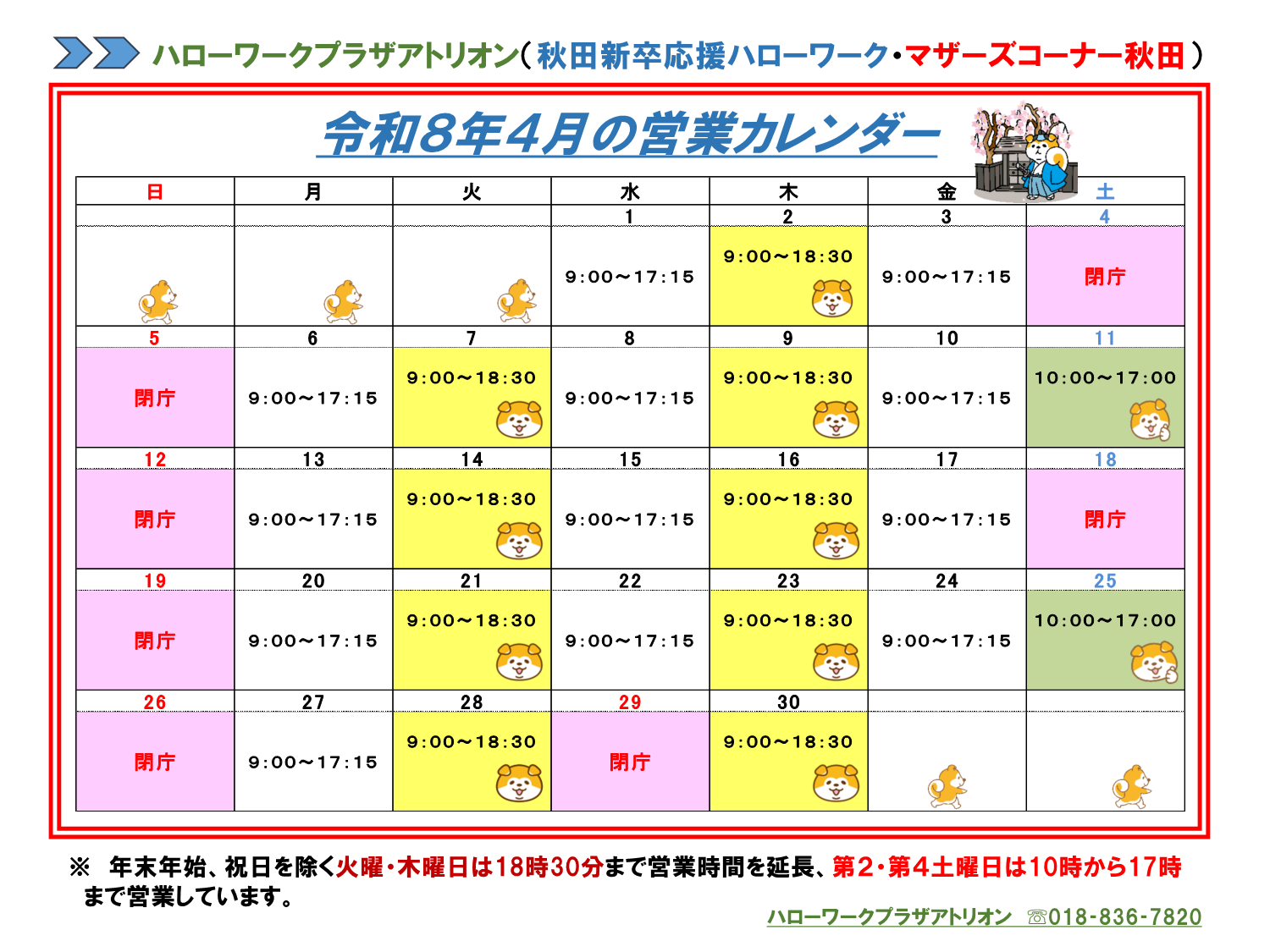 ハローワークプラザアトリオンの令和8年4月分開庁日カレンダーについて