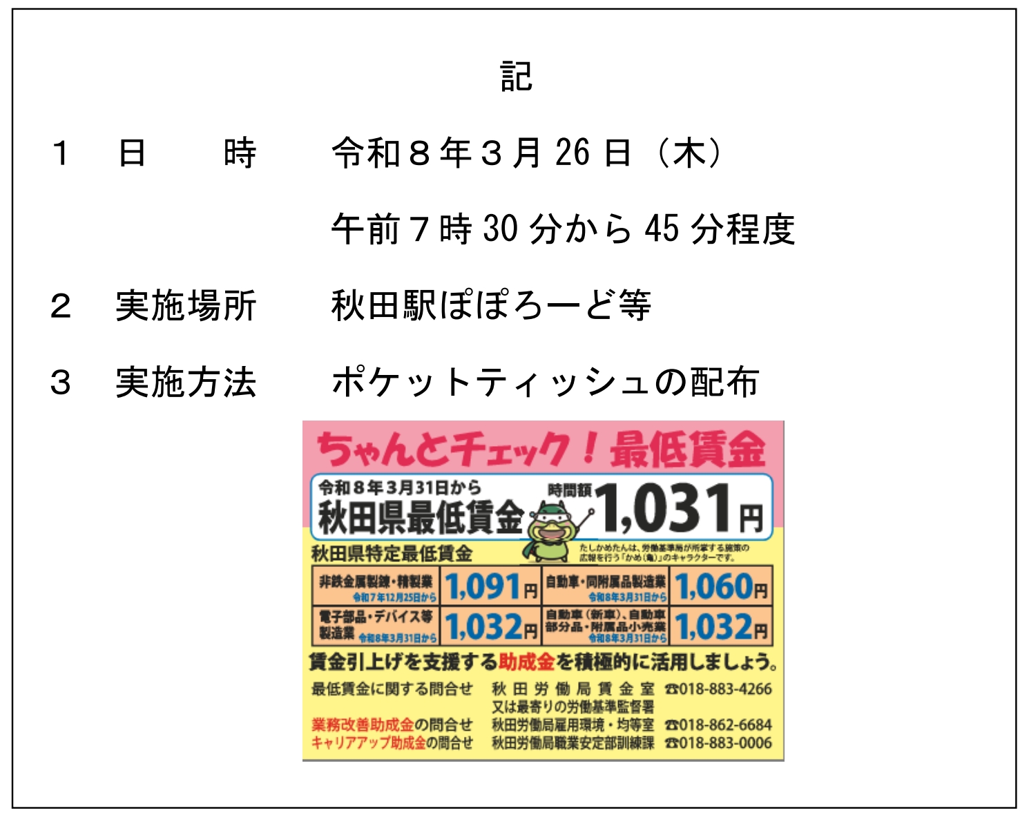 秋田労働局による秋田県最低賃金改定の周知・広報行動の実施について