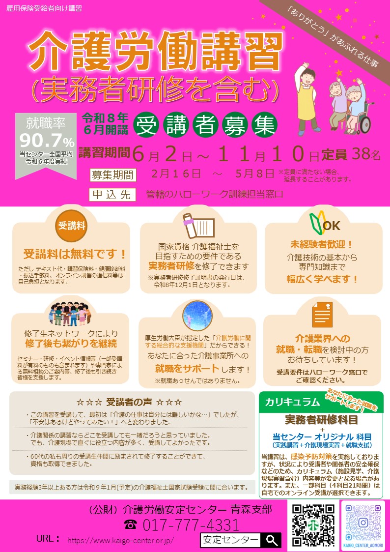 青森県内では、公益財団法人 介護労働安定センター青森支部で実施しています。