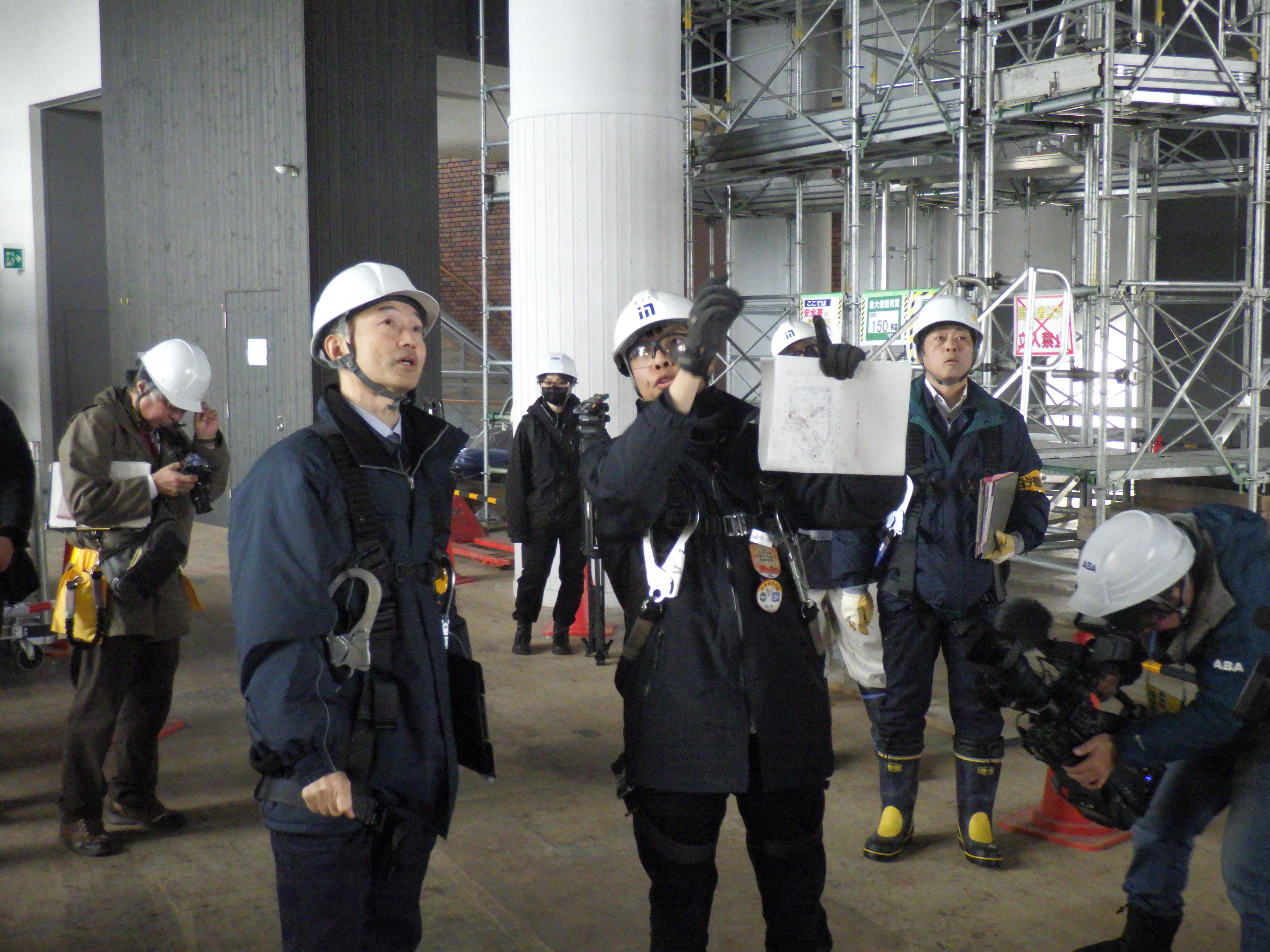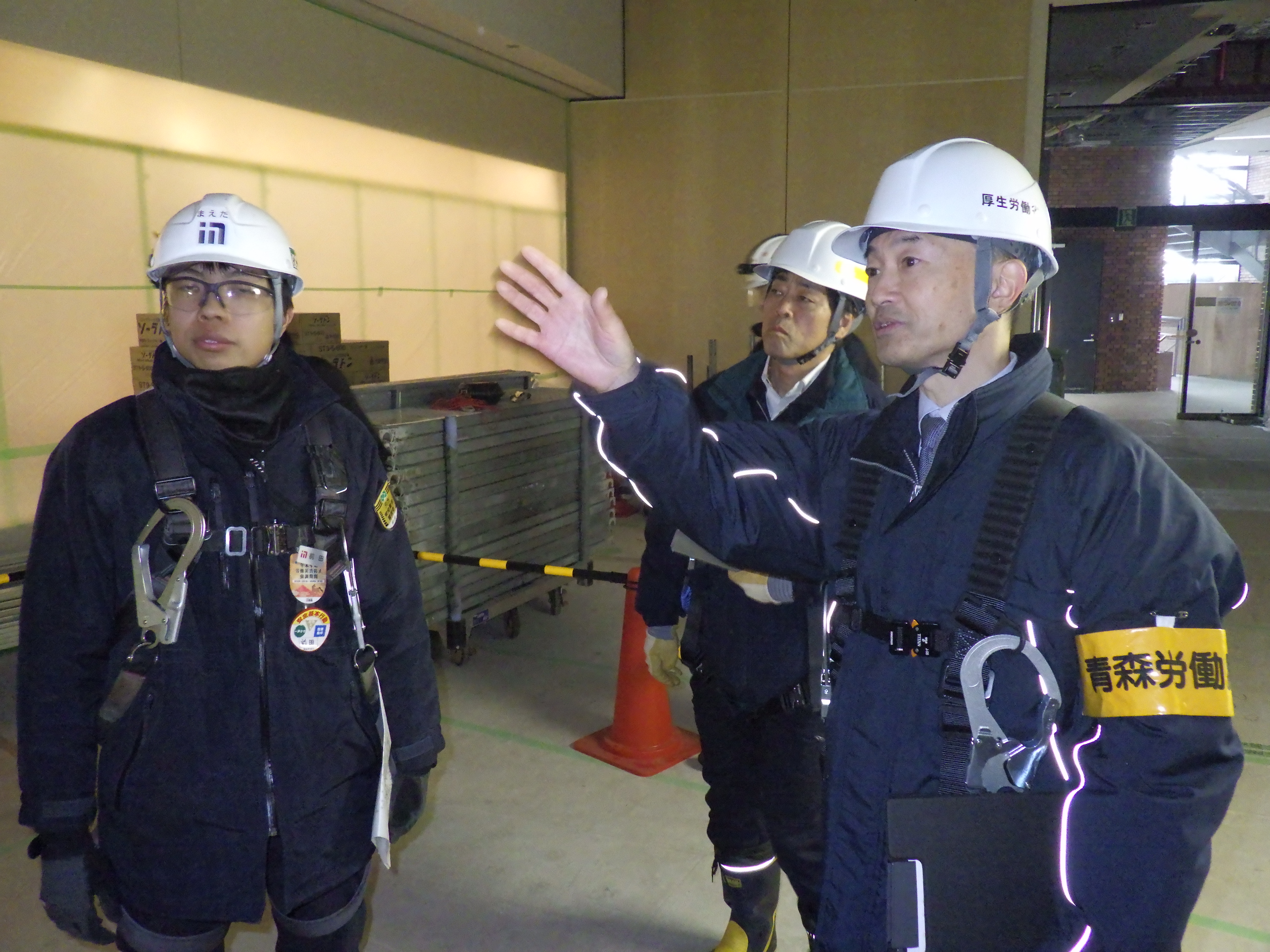 令和7年12月5日、角井局長は、東北ブロック労働局長と連携の上、冬期及び年末年始における労働災害の防止を呼び掛けるため「立佞武多の館大規模改修工事」の現場パトロールを実施し、重篤な災害につながる墜落・転落災害や冬期に多発する転倒災害などを防止するための取組を確認し、現場担当者と意見を交わしました。