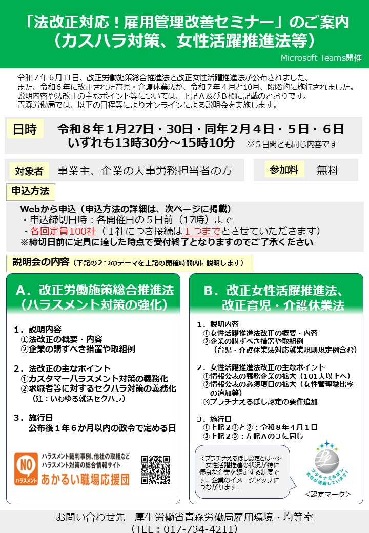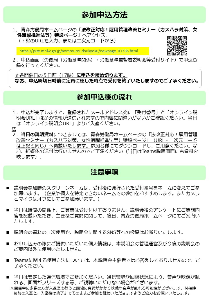 青森労働局では、以下の日程により、「法改正対応!雇用管理改善セミナー」(オンライン説明会)を実施しますので、ご検討のうえ、下記の「お申し込み方法」によりお申し込みください。