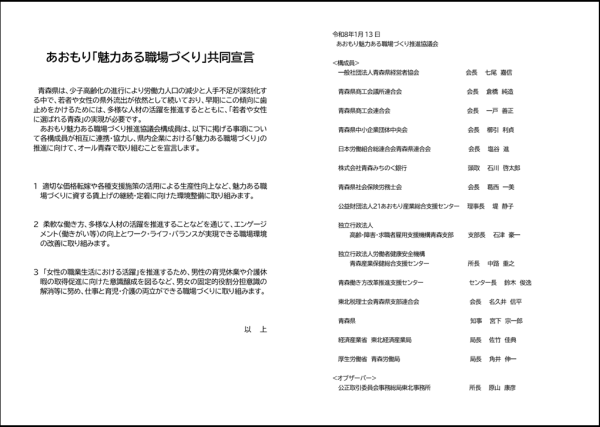 また、本協議会の設置要綱一部改正及び共同宣言(あおもり「魅力ある職場づくり」共同宣言)を提案し、満場一致で承認され、採択されました。