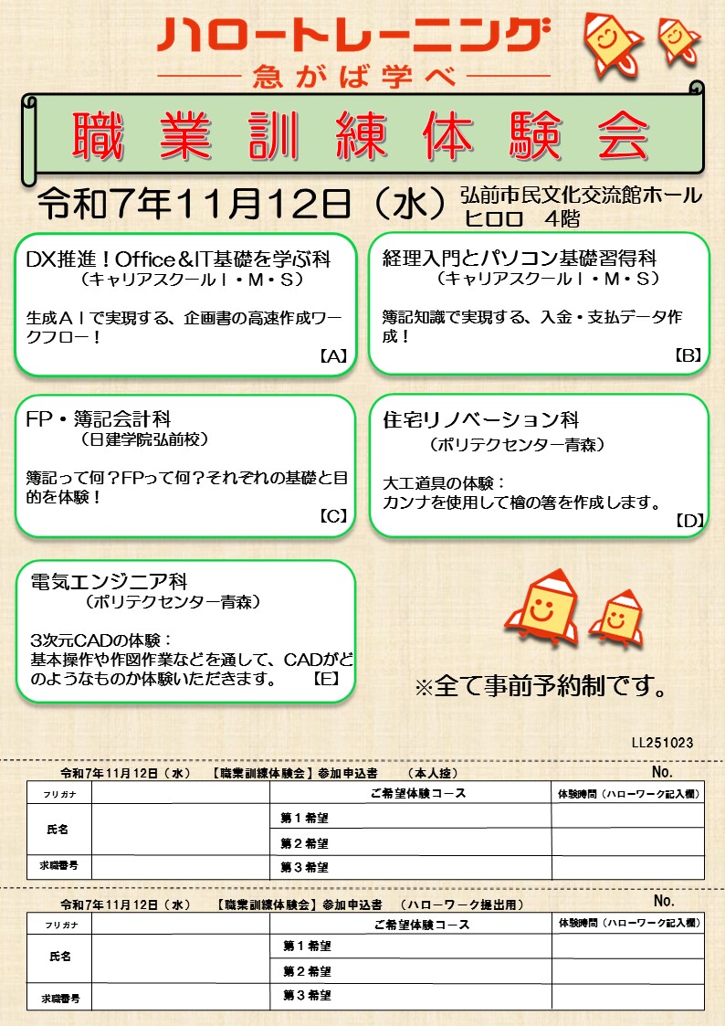 - 職業訓練体験会(ハローワーク弘前)【11月12日開催】