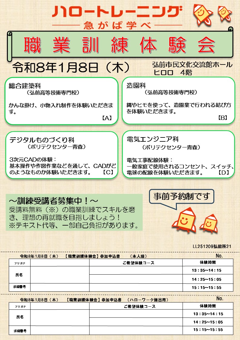 職業訓練体験会(ハローワーク弘前)【1月8日開催】