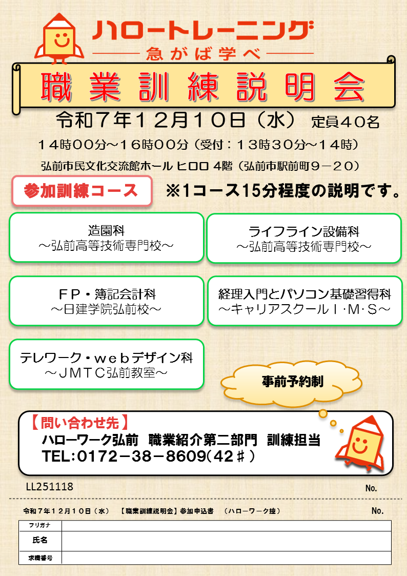 - 職業訓練説明会(ハローワーク弘前)【12月10日開催】