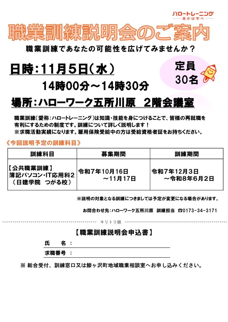 職業訓練説明会(ハローワーク五所川原)【11月5日開催】
