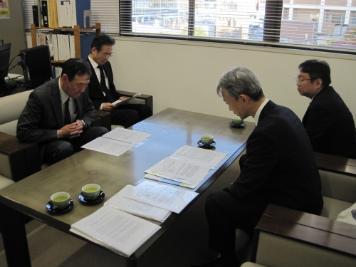 角井労働局長(右手前)、上野労働基準部長(右奥)、七尾会長(左手前)、小山田専務(左奥)