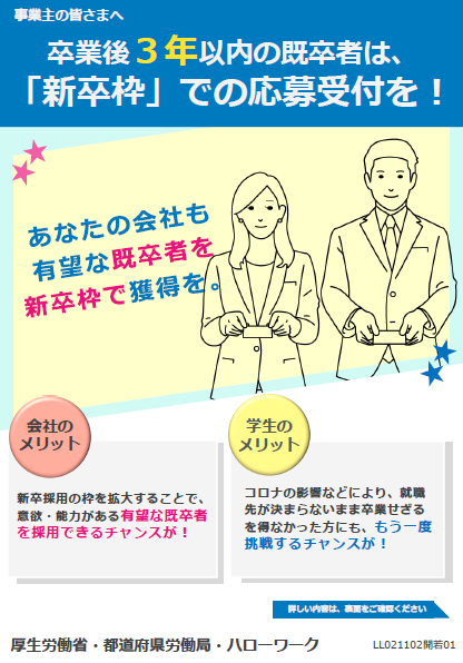 - 【事業主の皆さまへ】卒業後3年以内の既卒者は、「新卒枠」での応募受付を!