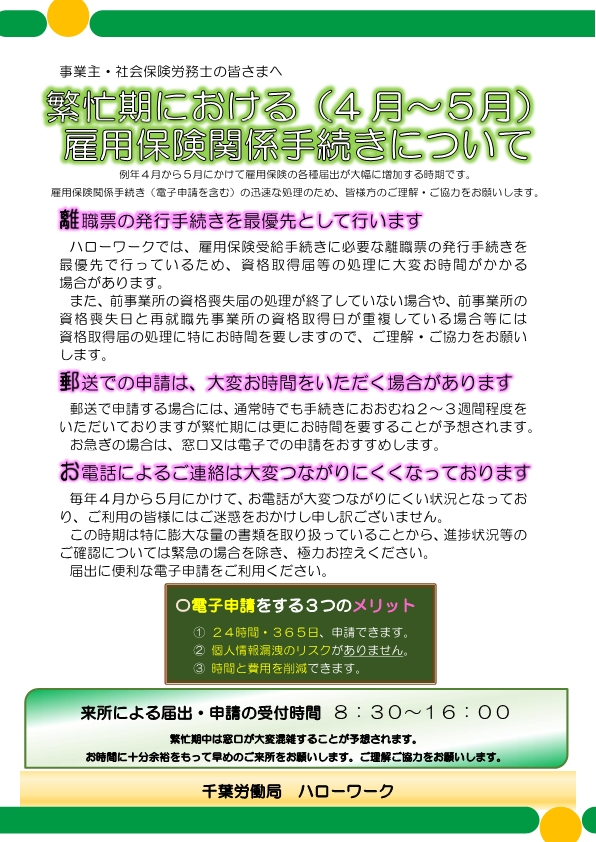例年4月から5月は雇用保険の各種届出が大幅に増加する時期です。 雇用保険関係手続き(電子申請を含む)の迅速な処理のため、通常と異なるご案内をさせていただく場合がございますが、皆さまのご理解・ご協力をお願いいたします。 詳細については以下のリーフレットをご確認ください。