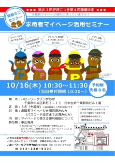 10月16日(木)開催 ~求職者マイページ便利に使っていますか?~「求職者マイページ活用セミナー」のお知らせ(ハローワークちば駅前プラザ)