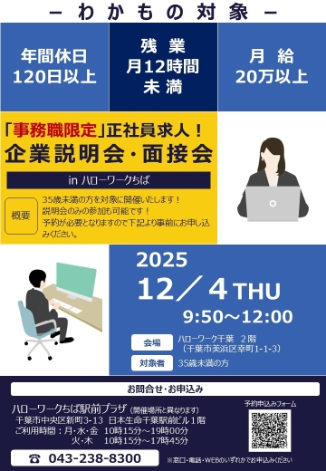 【ハローワークプラザちば】12月4日(木)「事務職限定!わかもの企業説明会・面接会」開催のお知らせ