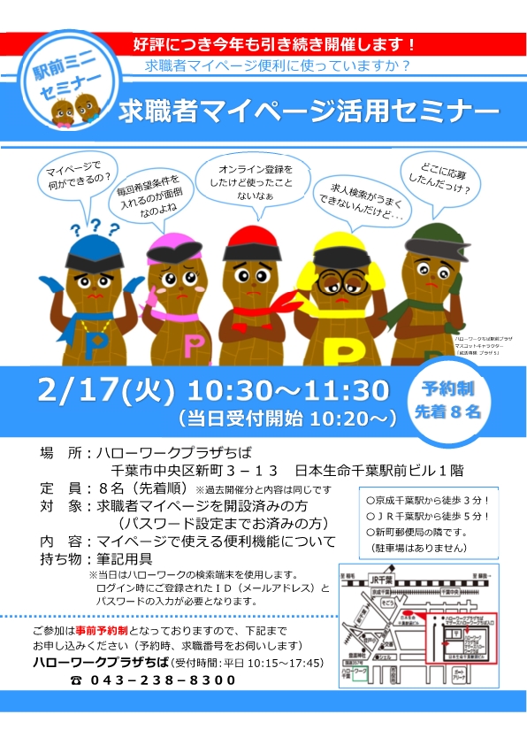千葉駅前のハローワークプラザちばにて、毎回好評の「求職者マイページ活用セミナー」を開催します。