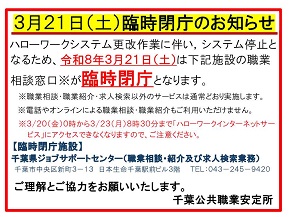 ハローワークシステム更改作業に伴い、システム停止となるため、令和8年3月21日(土)は千葉県ジョブサポートセンターの職業相談窓口(職業相談・紹介及び求人検索業務)が臨時閉庁となります。電話やオンラインによる職業相談・職業紹介もご利用いただけません。