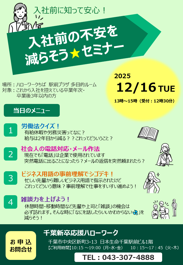 求職者 セミナー【千葉新卒応援ハローワーク】12月16日(火)「入社前の不安を減らそうセミナー」開催のお知らせ