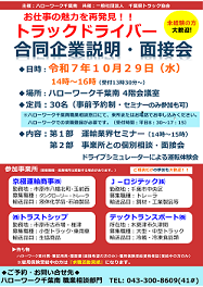 https://www.hellowork.mhlw.go.jp/kensaku/GECA110010.do?action=searchBtn&initDisp&screenId=GECA110010&kjKbnRadioBtn=1&tDFK1CmbBox=12&freeWordInput=%E3%83%88%E3%83%A9%E3%83%83%E3%82%AF%E3%83%89%E3%83%A9%E3%82%A4%E3%83%90%E3%83%BC%E5%90%88%E5%90%8C%E4%BC%81%E6%A5%AD%E8%AA%AC%E6%98%8E%E3%83%BB%E9%9D%A2%E6%8E%A5%E4%BC%9A