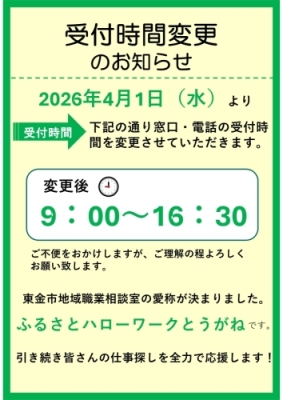 2026年4月1日(水曜日)から、東金市役所の窓口時間変更に伴い、東金市地域職業相談室においても、同様に受付時間が変更になります。 変更後の時間は9:00から16:30です。 併せて、愛称が「ふるさとハローワークとうがね」に決まりました! ご利用の皆様にはご不便おかけしますが、ご理解のほどよろしくお願いいたします。