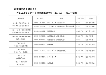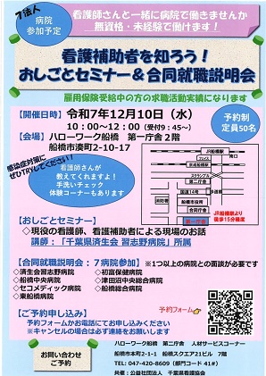 【ハローワーク船橋】12月10日(水)「看護補助者を知ろう!おしごとセミナー&合同就職説明会」のお知らせ