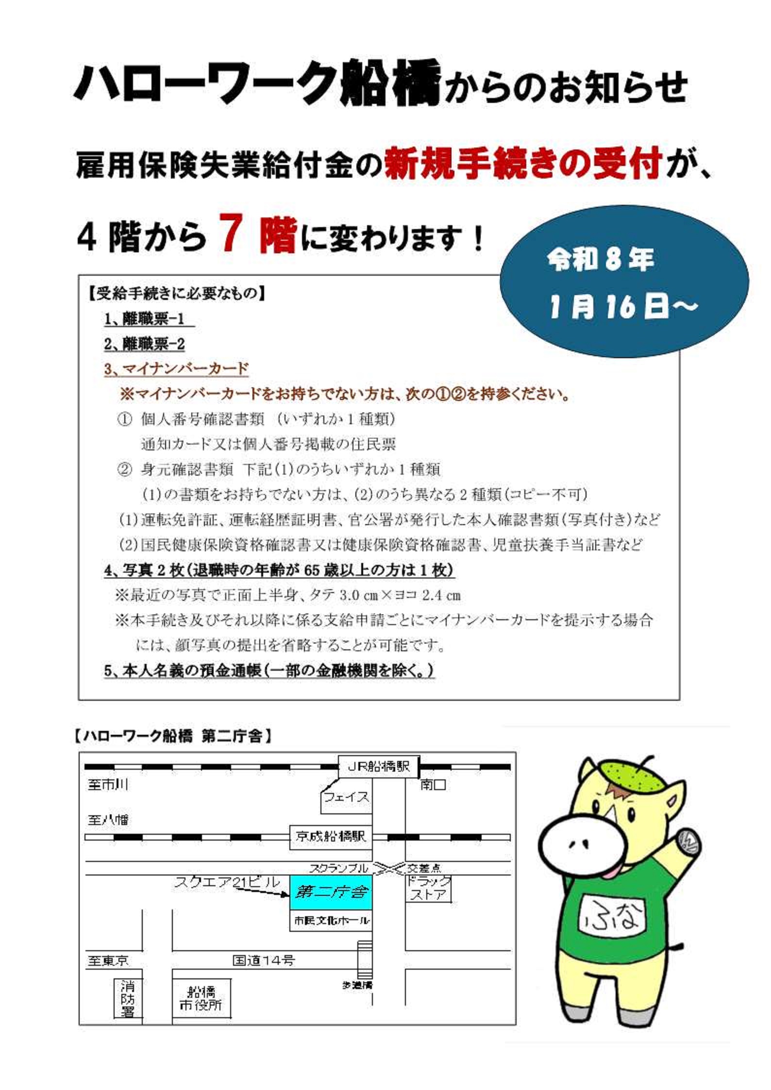 令和8年1月16日より、雇用保険失業給付金の新規手続きの受付が4階から7階に変わります! お手続きで来所された方は7階総合受付までお越しください。