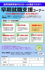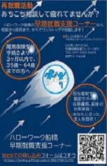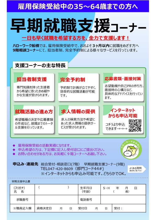 ハローワーク船橋では、雇用保険の受給の手続き後3ヶ月以内の方に向けた個別相談窓口として、早期就職支援コーナーがあります。