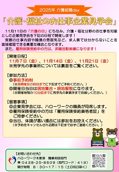 ハローワーク木更津では、11月11日の「介護の日」にちなみ、介護・福祉分野のお仕事を対象とした企業見学会を下記の日程で開催します。