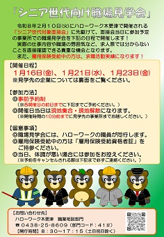 令和8年2月10日にハローワーク木更津で開催する「シニア世代対象面接会」の先駆けで、面接会当日に参加予定の企業のうち3つの事業所での職場見学会を下記の日程で開催します!