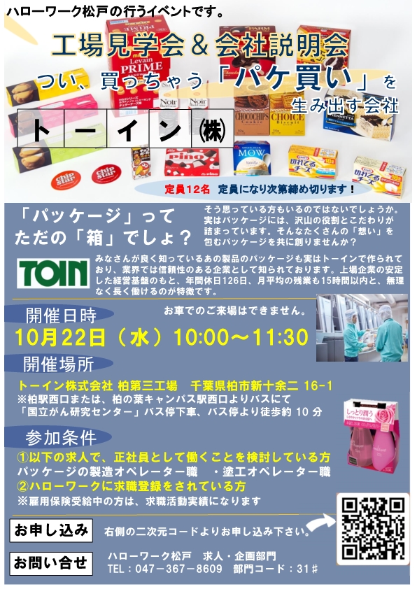 【ハローワーク松戸】10/22(水)工場見学&企業説明会を開催します!