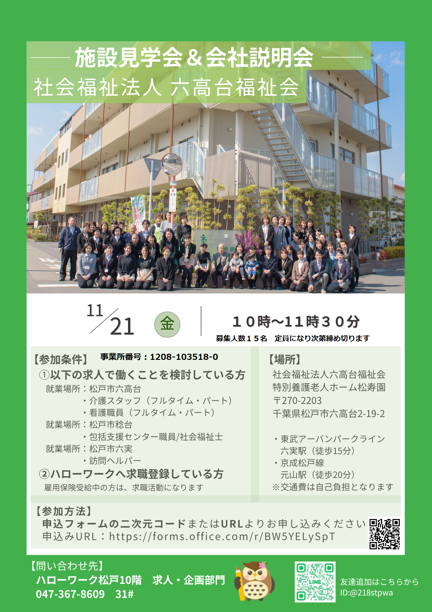 今年度、ハローワーク松戸が行う企業見学会&説明会 第3弾は、「介護施設のお仕事」をテーマに行います。
