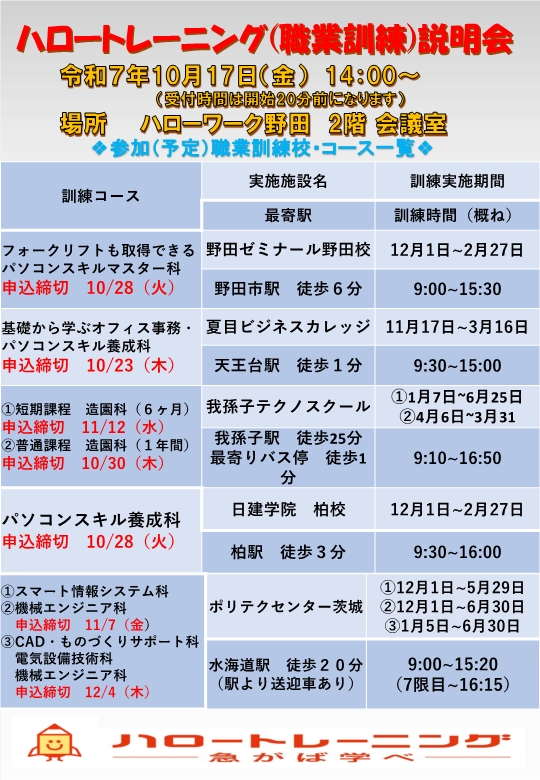 10/17開催 職業訓練(ハロートレーニング)説明会のお知らせ
