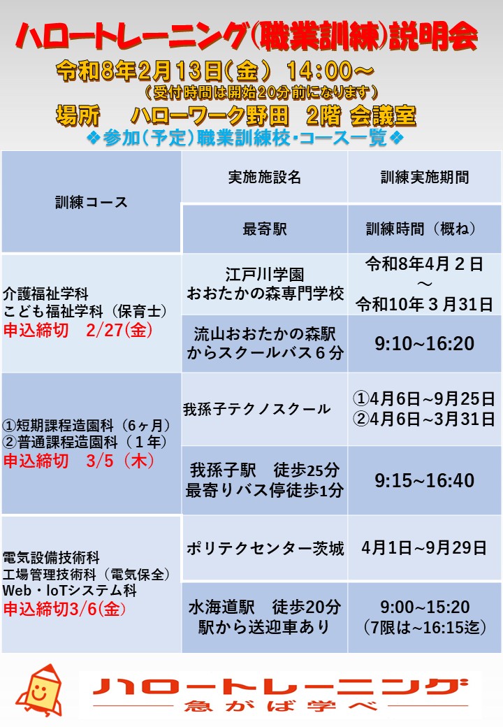ハローワーク野田では、職業訓練(ハロートレーニング)受講を検討されている方向けに、実際に訓練校の担当者様をお呼びして説明会を行っております。訓練校から直接話を聞ける貴重な機会です。是非お気軽にご参加ください。