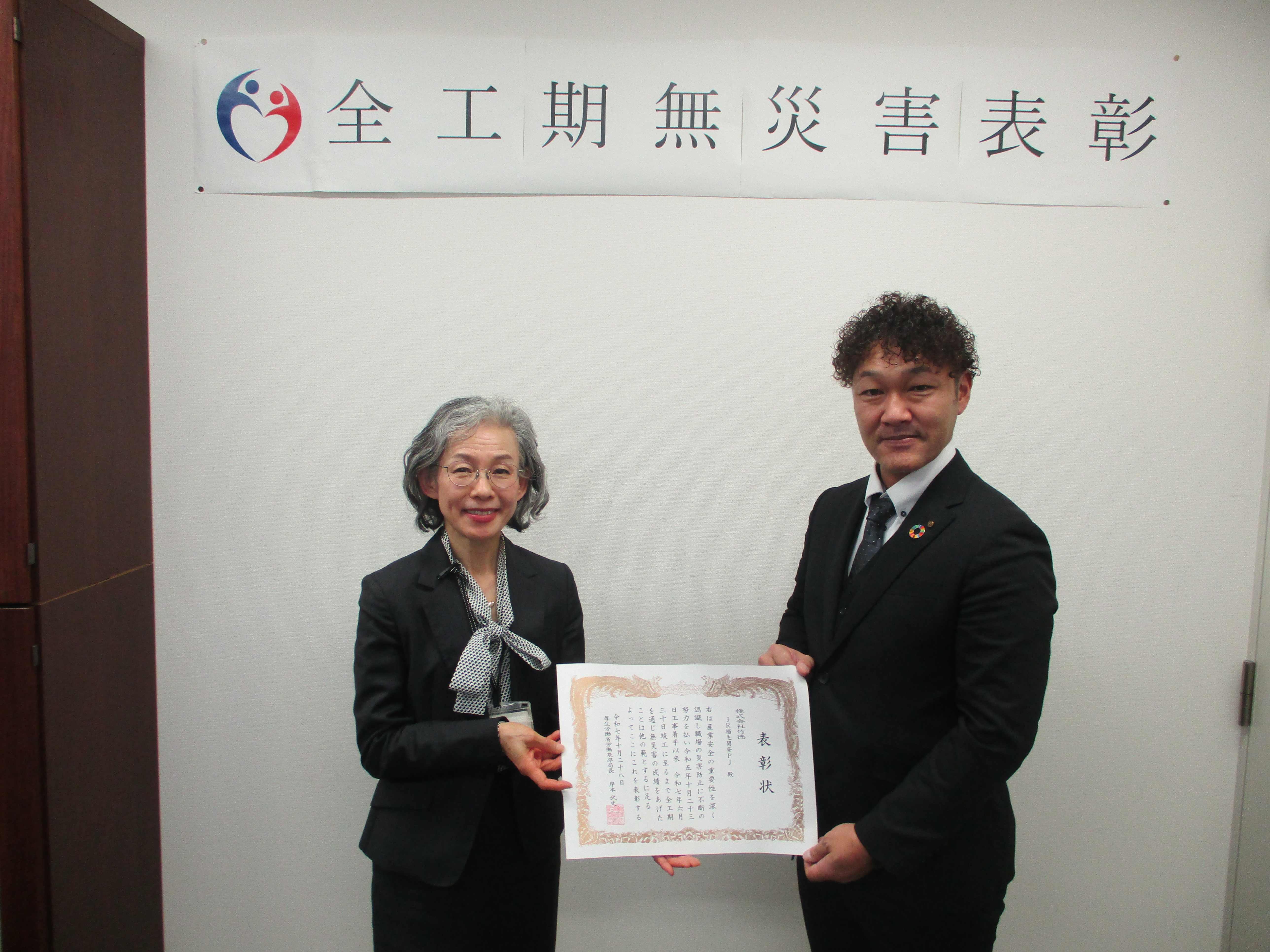 令和7年10月28日、千葉労働基準監督署長は、株式会社竹徳が施工した「JR稲毛開発PJ」について、令和5年10月から令和7年6月までの工期を、休業災害を発生させることなく竣工させたことから表彰いたしました。
