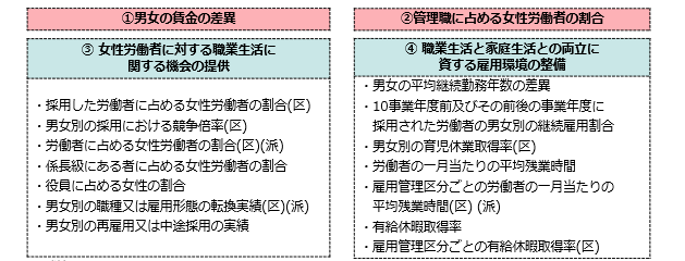 ①男女の賃金の差異及び②管理職に占める女性労働者の割合(令和8年4月1日の改正により追加)のそれぞれ一項目以上、③女性労働者に対する職業生活に関する機会の提供と④職業生活と家庭生活との両立に資する雇用環境整備のうちからいずれか1項目以上 計3項目以上を公表
