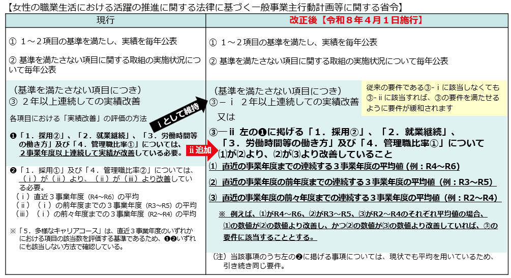 ●令和8年4月1日に女性活躍推進法改正が改正され、えるぼし認定(1段階目)の基準を見直しました。