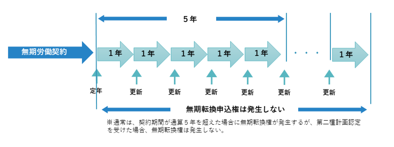 第二種計画認定の効力は、無期労働契約で定年を迎えた労働者を定年後に継続雇用する場合に及びます。有期労働契約で定年年齢(契約更新の上限年齢)を迎えた労働者や他社(特殊関係事業主(※1)を除く)で定年を迎えた労働者は対象となりません。